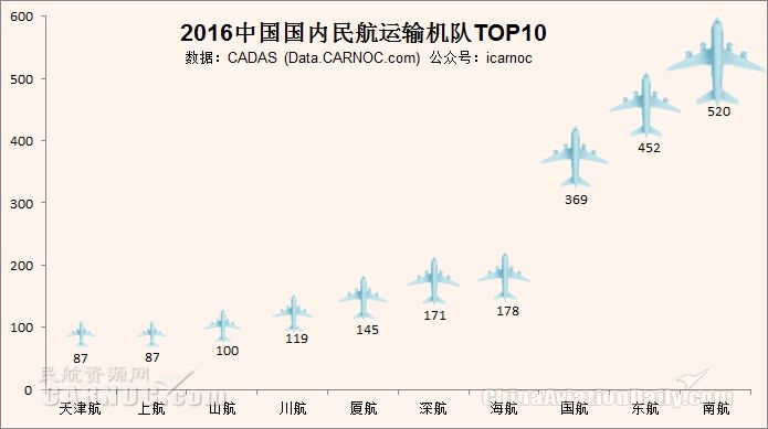機(jī)隊(duì)規(guī)模百架以上的航空公司共計(jì)8家,其中中國南方航空股份有限公司機(jī)隊(duì)擁有飛機(jī)520架;中國東方航空股份有限公司擁有452架飛機(jī),中國國際航空股份有限公司369架。海南航空股份有限公司178架。