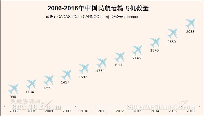 民航資源網(wǎng)2017年1月6日消息:根據(jù)CADAS民航數(shù)據(jù)分析系統(tǒng),至2016年底,中國民航運(yùn)輸飛機(jī)機(jī)隊(duì)數(shù)量(不含港、澳、臺(tái))達(dá)到了2933架, 全年共引進(jìn)飛機(jī)369架,其中12月份新引進(jìn)飛機(jī)36架。
